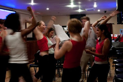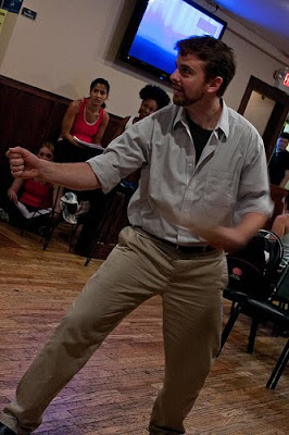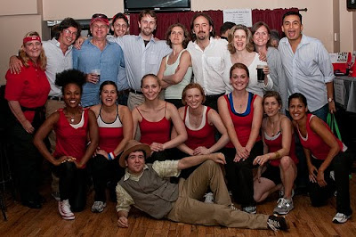 Here they are! When Isaiah Tanenbaum wasn’t busy heroically playing Xavier, the hard-nosed journalist and announcer of the Ladyhawks, he was taking these pictures – most are from our rehearsal that day, but a few are from the party itself. For more info on the event, go here; and to read artist/audience thoughts about the event, go here.